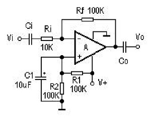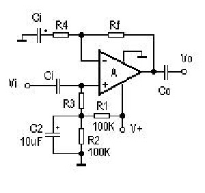Ka taea e tenei Amplifier te whakakapi i nga kaiwhaiwhai mo te AC Charfication, e tika ana mo nga tono penei i mua-whakarei i nga punaha oro.Kaore e hiahiatia he whakatikatika.Ka whakamahia e ia te toha mana kotahi, me te R1 me te R2 e hanga ana i te 1 / 2V + Bias.Ko te C1 te kaiwhakaari kino.