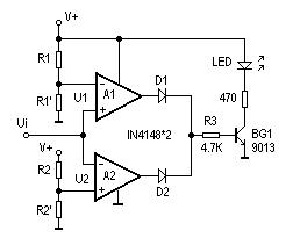 I tenei huringa, e rua nga amp-amps e whakamahia ana hei hanga i te kaihaka.Obsors R1 me R1 'Hangaia he Kaiwehe i te Kaimanaaki, te whakatu i te Taumata Whakatau U1 mo OP-AMP A1 A1 A1.Nga Rangahau R2 me R2 'Ko tetahi atu Tool Motuhake, te whakatu i te taumata whakataurite U2 mo OP-AMP A2.Ko te whakaurunga UI UI ka whakamahia i te wa ano ki te whakauru tika o te A1 me te whakauru kino o te A2.A, no te UI> U1, op-amp-amp A1 putanga he taumata tiketike;I te UI < U2, op-amp A2 outputs a high level. If either op-amp A1 or A2 outputs a high level, transistor BG1 conducts, and the LED lights up.